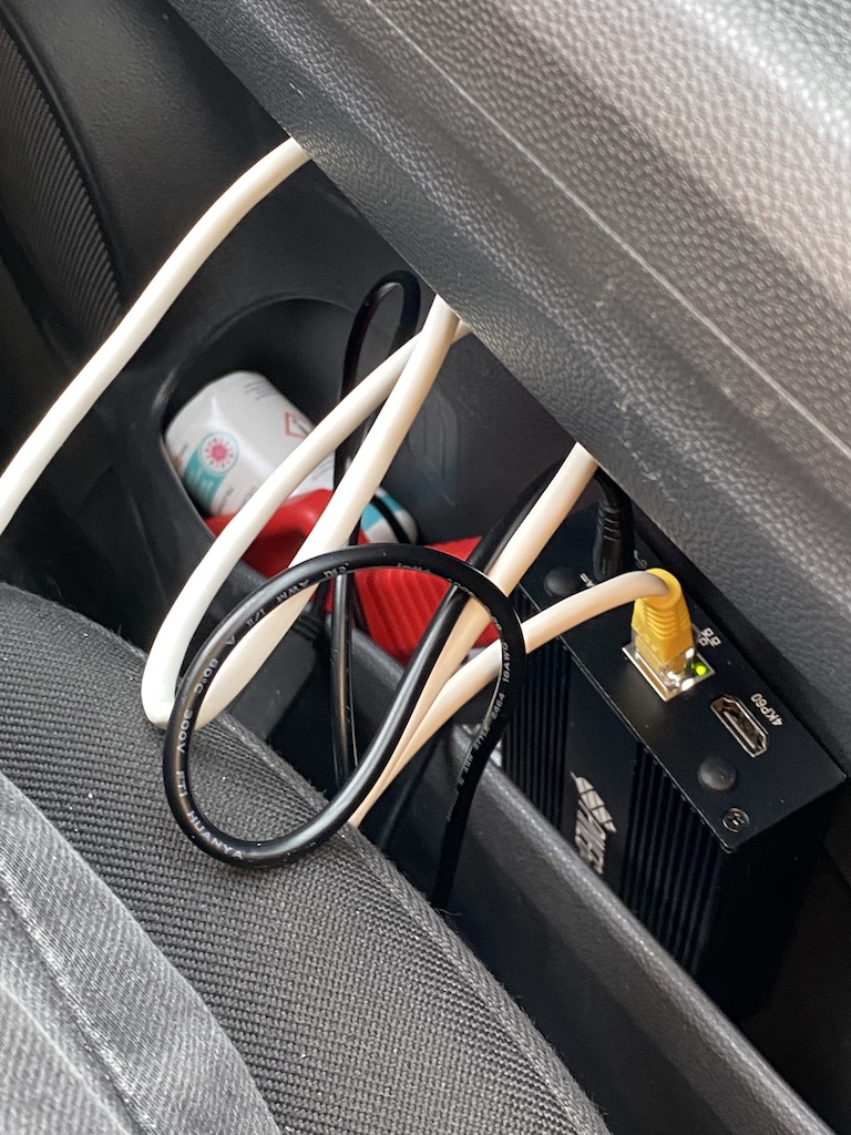 the setup is a cigarette lighter to 2x 230V converter, one being used to power the RockPro64, the other being used to power my notebook. My notebook is connected to the hotspot from my phone, while also being connected to a USB ethernet, the other end of which is plugged into the RockPro64.