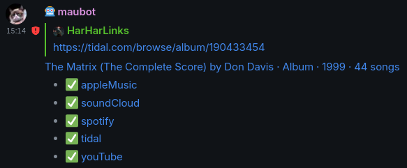 Therefore about month ago, I shared a maubot plugin on TWIM, which uses the REST API of sjdonado's I don't have Spotify webapp, which itself is also selfhostable open source software.